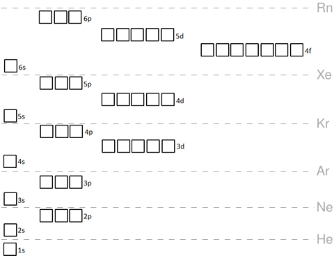 Aufbau principle: In ground state, the orbitals are filled from the bottom to the top (n and l), left to right(m_l). (each square in the image can hold two electrons of different m_s) (the orbital at the bottom has the lowest energy):